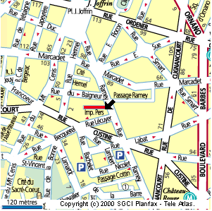 Au 42 de la Rue Hermel, Maison du Peuple français ouverte en 1894 par l'abbé Garnier pour répondre à la Maison du Peuple créée trois ans auparavant par des groupements socialistes dans la proche impasse Pers.