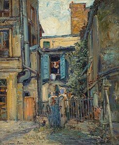 Öl/Lw. Blick in den Hof eines kleinen Hinterhauses mit bunter Wäsche